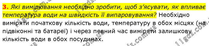 Які вимірювання необхідно зробити, щоб з’ясувати, як впливає температура води на швидкість її випаровування? Необхідно виміряти початкову кількість води, температуру в обох місцях (на підвіконні та батареї) і через певний час виміряти залишкову кількість води в обох посудинах.