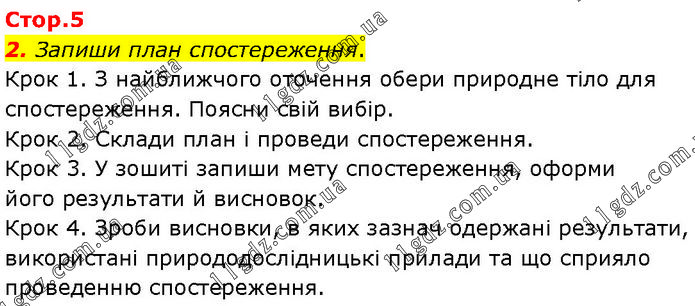 Запиши план спостереження. Крок 1. З найближчого оточення обери природне тіло для спостереження. Поясни свій вибір. Крок 2. Склади план і проведи спостереження. Крок 3. У зошиті запиши мету спостереження, оформи його результати й висновок. Крок 4. Зроби висновки, в яких зазнач одержані результати, використані природодослідницькі прилади та що сприяло проведенню спостереження.