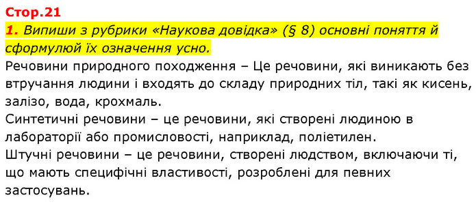 1. Випиши з рубрики «Наукова довідка» (§ 8) основні поняття й сформулюй їх означення усно. Речовини природного походження – Це речовини, які виникають без втручання людини і входять до складу природних тіл, такі як кисень, залізо, вода, крохмаль. Синтетичні речовини – це речовини, які створені людиною в лабораторії або промисловості, наприклад, поліетилен. Штучні речовини – це речовини, створені людством, включаючи ті, що мають специфічні властивості, розроблені для певних застосувань.