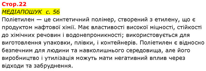 МЕДІАПОШУК с. 56 Поліетилен — це синтетичний полімер, створений з етилену, що є продуктом нафтової хімії. Має властивості високої міцності, стійкості до хімічних речовин і водонепроникності; використовується для виготовлення упаковки, плівки, і контейнерів. Поліетилен є відносно безпечним для людини та навколишнього середовища, але його виробництво і утилізація можуть мати негативний вплив через відходи та забруднення.