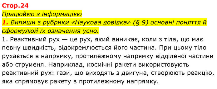 Працюймо з інформацією 1. Випиши з рубрики «Наукова довідка» (§ 9) основні поняття й сформулюй їх означення усно. 1. Реактивний рух — це рух, який виникає, коли з тіла, що має певну швидкість, відокремлюється його частина. При цьому тіло рухається в напрямку, протилежному напрямку відділеної частини або струменя. Наприклад, космічні ракети використовують реактивний рух: гази, що виходять з двигуна, створюють реакцію, яка спрямовує ракету в протилежному напрямку.
