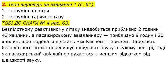 2. Твоя відповідь на завдання 1 (с. 61). 1 – струмінь повітря 2 – струмінь гарячого газу ТОБІ ДО СНАГИ № 4 нас. 63. Безпілотному реактивному літаку знадобиться приблизно 2 години і 43 хвилини, а пасажирському авіалайнеру — приблизно 9 годин і 20 хвилин, щоб подолати відстань між Києвом і Парижем. Швидкість безпілотного літака перевищує швидкість звуку в сухому повітрі, тоді як пасажирський авіалайнер рухається з меншим відсотком від швидкості звуку.