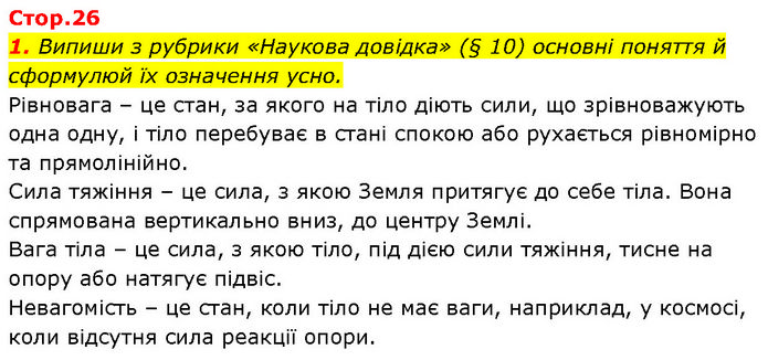 1. Випиши з рубрики «Наукова довідка» (§ 10) основні поняття й сформулюй їх означення усно. Рівновага – це стан, за якого на тіло діють сили, що зрівноважують одна одну, і тіло перебуває в стані спокою або рухається рівномірно та прямолінійно. Сила тяжіння – це сила, з якою Земля притягує до себе тіла. Вона спрямована вертикально вниз, до центру Землі. Вага тіла – це сила, з якою тіло, під дією сили тяжіння, тисне на опору або натягує підвіс. Невагомість – це стан, коли тіло не має ваги, наприклад, у космосі, коли відсутня сила реакції опори.