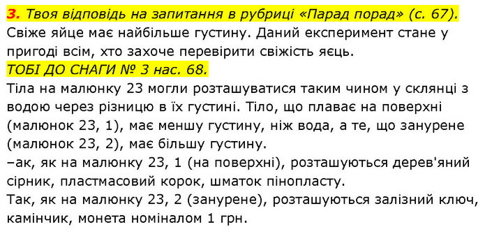 3. Твоя відповідь на запитання в рубриці «Парад порад» (с. 67). Свіже яйце має найбільше густину. Даний експеримент стане у пригоді всім, хто захоче перевірити свіжість яєць. ТОБІ ДО СНАГИ № 3 нас. 68. Тіла на малюнку 23 могли розташуватися таким чином у склянці з водою через різницю в їх густині. Тіло, що плаває на поверхні (малюнок 23, 1), має меншу густину, ніж вода, а те, що занурене (малюнок 23, 2), має більшу густину. –ак, як на малюнку 23, 1 (на поверхні), розташуються дерев'яний сірник, пластмасовий корок, шматок пінопласту. Так, як на малюнку 23, 2 (занурене), розташуються залізний ключ, камінчик, монета номіналом 1 грн.