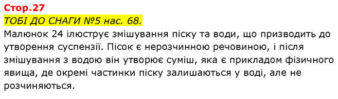 ТОБІ ДО СНАГИ №5 нас. 68. Малюнок 24 ілюструє змішування піску та води, що призводить до утворення суспензії. Пісок є нерозчинною речовиною, і після змішування з водою він утворює суміш, яка є прикладом фізичного явища, де окремі частинки піску залишаються у воді, але не розчиняються.