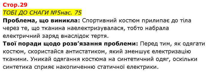 ТОБІ ДО СНАГИ №5нас. 75 Проблема, що виникла: Спортивний костюм прилипає до тіла через те, що тканина наелектризувалася, тобто набрала електричний заряд внаслідок тертя. Твої поради щодо розв’язання проблеми: Перед тим, як одягати костюм, скористайся антистатиком, який зменшує електризацію тканини. Уникай одягання костюма на синтетичний одяг, оскільки синтетика сприяє накопиченню статичної електрики.