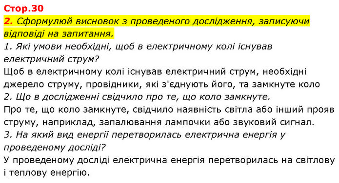 2. Сформулюй висновок з проведеного дослідження, записуючи відповіді на запитання. 1. Які умови необхідні, щоб в електричному колі існував електричний струм? Щоб в електричному колі існував електричний струм, необхідні джерело струму, провідники, які з'єднують його, та замкнуте коло 2. Що в дослідженні свідчило про те, що коло замкнуте. Про те, що коло замкнуте, свідчило наявність світла або інший прояв струму, наприклад, запалювання лампочки або звуковий сигнал. 3. На який вид енергії перетворилась електрична енергія у проведеному досліді? У проведеному досліді електрична енергія перетворилась на світлову і теплову енергію.