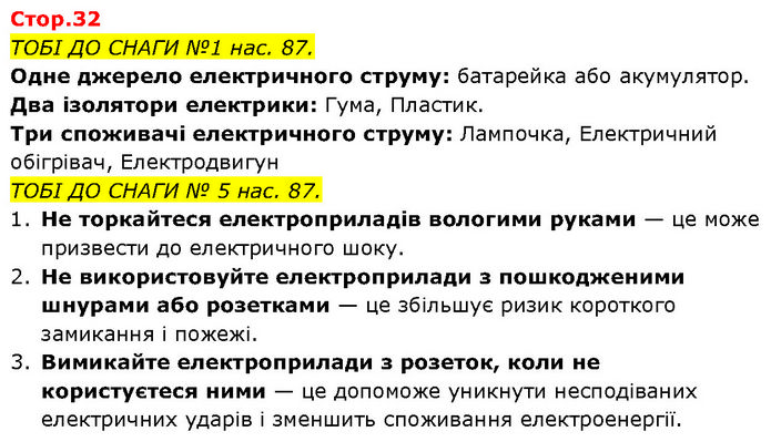 ТОБІ ДО СНАГИ №1 нас. 87. Одне джерело електричного струму: батарейка або акумулятор. Два ізолятори електрики: Гума, Пластик. Три споживачі електричного струму: Лампочка, Електричний обігрівач, Електродвигун ТОБІ ДО СНАГИ № 5 нас. 87. 1. Не торкайтеся електроприладів вологими руками — це може призвести до електричного шоку. 2. Не використовуйте електроприлади з пошкодженими шнурами або розетками — це збільшує ризик короткого замикання і пожежі. 3. Вимикайте електроприлади з розеток, коли не користуєтеся ними — це допоможе уникнути несподіваних електричних ударів і зменшить споживання електроенергії.