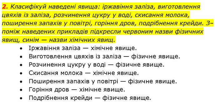 2. Класифікуй наведені явища: іржавіння заліза, виготовлення цвяхів із заліза, розчинення цукру у воді, скисання молока, поширення запахів у повітрі, горіння дров, подрібнення крейди. З–поміж наведених прикладів підкресли червоним назви фізичних явищ, синім — назви хімічних явищ. • Іржавіння заліза — хімічне явище. • Виготовлення цвяхів із заліза — фізичне явище. • Розчинення цукру у воді — фізичне явище. • Скисання молока — хімічне явище. • Поширення запахів у повітрі — фізичне явище. • Горіння дров — хімічне явище. • Подрібнення крейди — фізичне явище.