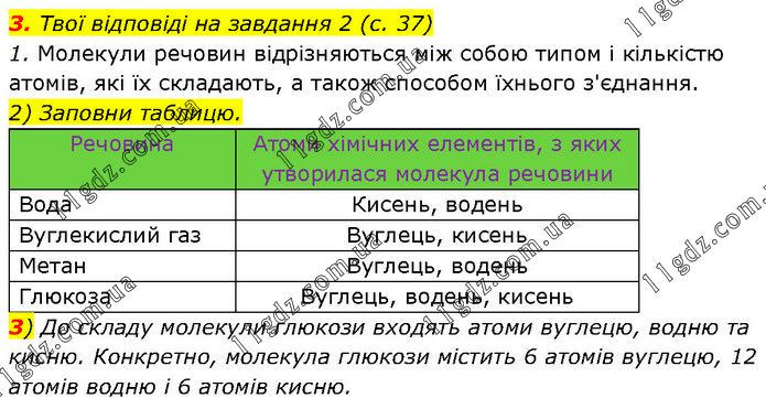3. Твої відповіді на завдання 2 (с. 37) 1. Молекули речовин відрізняються між собою типом і кількістю атомів, які їх складають, а також способом їхнього з'єднання. 2) Заповни таблицю. Речовина Атоми хімічних елементів, з яких утворилася молекула речовини Вода Кисень, водень Вуглекислий газ Вуглець, кисень Метан Вуглець, водень Глюкоза Вуглець, водень, кисень 3) До складу молекули глюкози входять атоми вуглецю, водню та кисню. Конкретно, молекула глюкози містить 6 атомів вуглецю, 12 атомів водню і 6 атомів кисню.