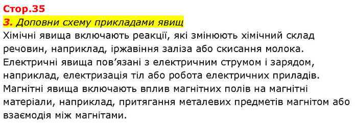3. Доповни схему прикладами явищ Хімічні явища включають реакції, які змінюють хімічний склад речовин, наприклад, іржавіння заліза або скисання молока. Електричні явища пов’язані з електричним струмом і зарядом, наприклад, електризація тіл або робота електричних приладів. Магнітні явища включають вплив магнітних полів на магнітні матеріали, наприклад, притягання металевих предметів магнітом або взаємодія між магнітами.