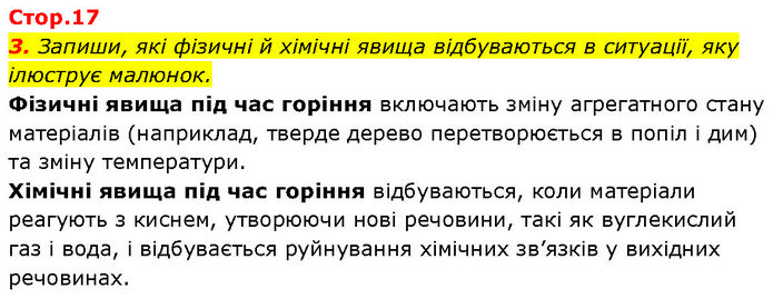 Запиши, які фізичні й хімічні явища відбуваються в ситуації, яку ілюструє малюнок. Фізичні явища під час горіння включають зміну агрегатного стану матеріалів (наприклад, тверде дерево перетворюється в попіл і дим) та зміну температури. Хімічні явища під час горіння відбуваються, коли матеріали реагують з киснем, утворюючи нові речовини, такі як вуглекислий газ і вода, і відбувається руйнування хімічних зв’язків у вихідних речовинах.