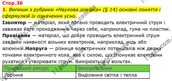Випиши з рубрики «Наукова довідка» (§ 14) основні поняття і сформулюй їх означення усно. Ізолятор — матеріал, який погано проводить електричний струм і заважає його проходженню через себе, наприклад, гума чи пластик. Провідник — матеріал, що добре проводить електричний струм завдяки наявності вільних електронів, наприклад, мідь або алюміній.Напруга — різниця електричних потенціалів між двома точками електричного кола, яка є силою, що спонукає електрони рухатися і утворювати струм. Вимірюється у вольтах.