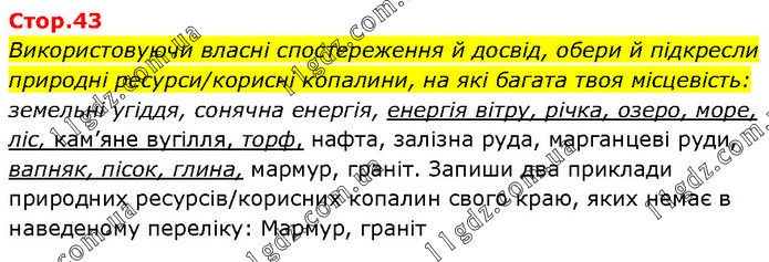 Використовуючи власні спостереження й досвід, обери й підкресли природні ресурси/корисні копалини, на які багата твоя місцевість: земельні угіддя, сонячна енергія, енергія вітру, річка, озеро, море, ліс, кам’яне вугілля, торф, нафта, залізна руда, марганцеві руди, вапняк, пісок, глина, мармур, граніт. Запиши два приклади природних ресурсів/корисних копалин свого краю, яких немає в наведеному переліку: Мармур, граніт