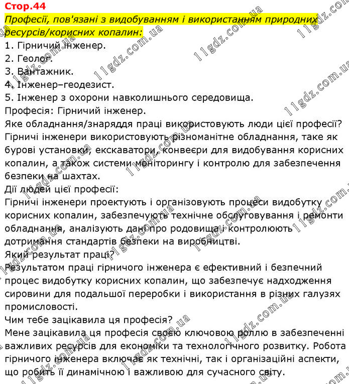 Професії, пов'язані з видобуванням і використанням природних ресурсів/корисних копалин: 1. Гірничий інженер. 2. Геолог. 3. Вантажник. 4. Інженер–геодезист. 5. Інженер з охорони навколишнього середовища. Професія: Гірничий інженер. Яке обладнання/знаряддя праці використовують люди цієї професії? Гірничі інженери використовують різноманітне обладнання, таке як бурові установки, екскаватори, конвеєри для видобування корисних копалин, а також системи моніторингу і контролю для забезпечення безпеки на шахтах. Дії людей цієї професії: Гірничі інженери проектують і організовують процеси видобутку корисних копалин, забезпечують технічне обслуговування і ремонти обладнання, аналізують дані про родовища і контролюють дотримання стандартів безпеки на виробництві. Який результат праці? Результатом праці гірничого інженера є ефективний і безпечний процес видобутку корисних копалин, що забезпечує надходження сировини для подальшої переробки і використання в різних галузях промисловості. Чим тебе зацікавила ця професія? Мене зацікавила ця професія своєю ключовою роллю в забезпеченні важливих ресурсів для економіки та технологічного розвитку. Робота гірничого інженера включає як технічні, так і організаційні аспекти, що робить її динамічною і важливою для сучасного світу.