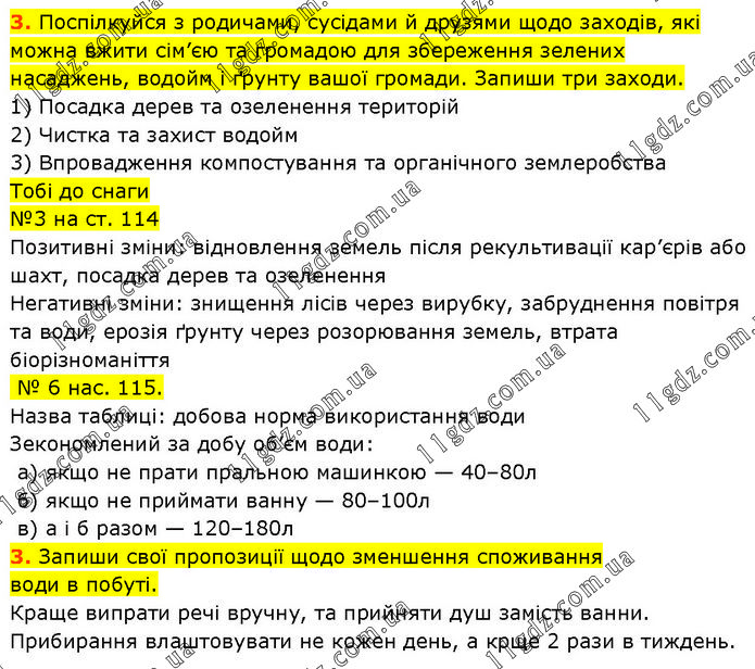 3. Поспілкуйся з родичами, сусідами й друзями щодо заходів, які можна вжити сім’єю та громадою для збереження зелених насаджень, водойм і ґрунту вашої громади. Запиши три заходи. 1) Посадка дерев та озеленення територій 2) Чистка та захист водойм 3) Впровадження компостування та органічного землеробства Тобі до снаги №3 на ст. 114 Позитивні зміни: відновлення земель після рекультивації кар’єрів або шахт, посадка дерев та озеленення Негативні зміни: знищення лісів через вирубку, забруднення повітря та води, ерозія ґрунту через розорювання земель, втрата біорізноманіття № 6 нас. 115. Назва таблиці: добова норма використання води Зекономлений за добу об’єм води: а) якщо не прати пральною машинкою — 40–80л б) якщо не приймати ванну — 80–100л в) а і б разом — 120–180л 3. Запиши свої пропозиції щодо зменшення споживання води в побуті. Краще випрати речі вручну, та прийняти душ замість ванни. Прибирання влаштовувати не кожен день, а крще 2 рази в тиждень.