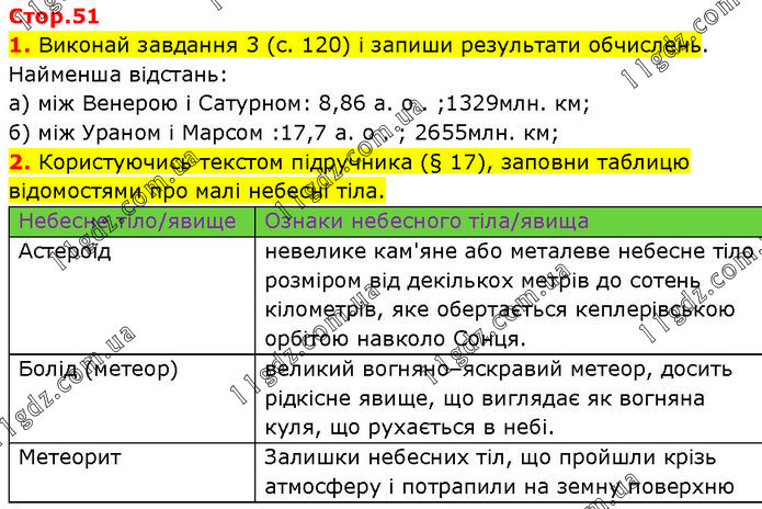 1. Виконай завдання 3 (с. 120) і запиши результати обчислень. Найменша відстань: а) між Венерою і Сатурном: 8,86 а. о . ;1329млн. км; б) між Ураном і Марсом :17,7 а. о . ; 2655млн. км; 2. Користуючись текстом підручника (§ 17), заповни таблицю відомостями про малі небесні тіла.