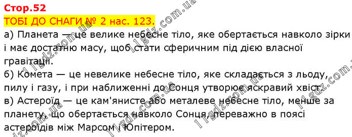 ТОБІ ДО СНАГИ № 2 нас. 123. а) Планета — це велике небесне тіло, яке обертається навколо зірки і має достатню масу, щоб стати сферичним під дією власної гравітації. б) Комета — це невелике небесне тіло, яке складається з льоду, пилу і газу, і при наближенні до Сонця утворює яскравий хвіст. в) Астероїд — це кам'янисте або металеве небесне тіло, менше за планету, що обертається навколо Сонця, переважно в поясі астероїдів між Марсом і Юпітером.