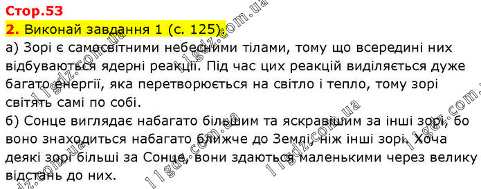 Виконай завдання 1 (с. 125). а) Зорі є самосвітними небесними тілами, тому що всередині них відбуваються ядерні реакції. Під час цих реакцій виділяється дуже багато енергії, яка перетворюється на світло і тепло, тому зорі світять самі по собі. б) Сонце виглядає набагато більшим та яскравішим за інші зорі, бо воно знаходиться набагато ближче до Землі, ніж інші зорі. Хоча деякі зорі більші за Сонце, вони здаються маленькими через велику відстань до них.