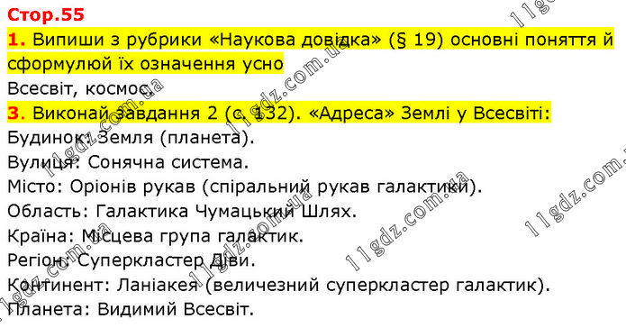 1. Випиши з рубрики «Наукова довідка» (§ 19) основні поняття й сформулюй їх означення усно Всесвіт, космос. 3. Виконай завдання 2 (с. 132). «Адреса» Землі у Всесвіті: Будинок: Земля (планета). Вулиця: Сонячна система. Місто: Оріонів рукав (спіральний рукав галактики). Область: Галактика Чумацький Шлях. Країна: Місцева група галактик. Регіон: Суперкластер Діви. Континент: Ланіакея (величезний суперкластер галактик). Планета: Видимий Всесвіт.