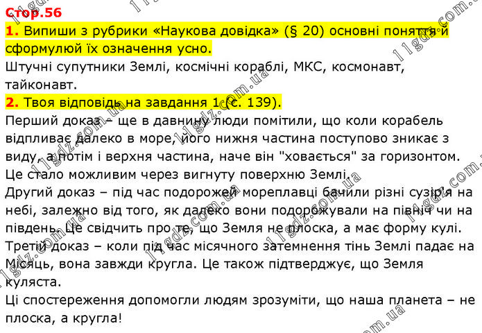 1. Випиши з рубрики «Наукова довідка» (§ 20) основні поняття й сформулюй їх означення усно. Штучні супутники Землі, космічні кораблі, МКС, космонавт, тайконавт. 2. Твоя відповідь на завдання 1 (с. 139). Перший доказ – ще в давнину люди помітили, що коли корабель відпливає далеко в море, його нижня частина поступово зникає з виду, а потім і верхня частина, наче він "ховається" за горизонтом. Це стало можливим через вигнуту поверхню Землі. Другий доказ – під час подорожей мореплавці бачили різні сузір'я на небі, залежно від того, як далеко вони подорожували на північ чи на південь. Це свідчить про те, що Земля не плоска, а має форму кулі. Третій доказ – коли під час місячного затемнення тінь Землі падає на Місяць, вона завжди кругла. Це також підтверджує, що Земля куляста. Ці спостереження допомогли людям зрозуміти, що наша планета – не плоска, а кругла!