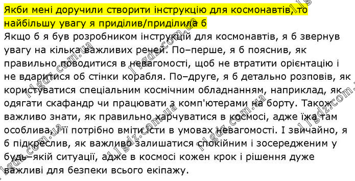 Якби мені доручили створити інструкцію для космонавтів, то найбільшу увагу я приділив/приділила б Якщо б я був розробником інструкцій для космонавтів, я б звернув увагу на кілька важливих речей. По–перше, я б пояснив, як правильно поводитися в невагомості, щоб не втратити орієнтацію і не вдаритися об стінки корабля. По–друге, я б детально розповів, як користуватися спеціальним космічним обладнанням, наприклад, як одягати скафандр чи працювати з комп'ютерами на борту. Також важливо знати, як правильно харчуватися в космосі, адже їжа там особлива, і її потрібно вміти їсти в умовах невагомості. І звичайно, я б підкреслив, як важливо залишатися спокійним і зосередженим у будь–якій ситуації, адже в космосі кожен крок і рішення дуже важливі для безпеки всього екіпажу.