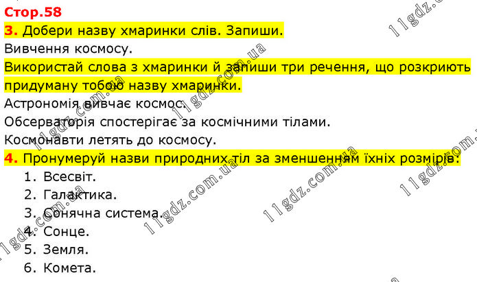 3. Добери назву хмаринки слів. Запиши. Вивчення космосу. Використай слова з хмаринки й запиши три речення, що розкриють придуману тобою назву хмаринки. Астрономія вивчає космос. Обсерваторія спостерігає за космічними тілами. Космонавти летять до космосу. 4. Пронумеруй назви природних тіл за зменшенням їхніх розмірів: 1. Всесвіт. 2. Галактика. 3. Сонячна система. 4. Сонце. 5. Земля. 6. Комета.