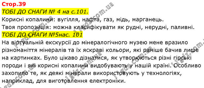 ТОБІ ДО СНАГИ № 4 на с.101. Корисні копалини: вугілля, нафта, газ, мідь, марганець. Твоя пропозиція: можна класифікувати як рудні, нерудні, паливні. ТОБІ ДО СНАГИ №5нас. 101 На віртуальній екскурсії до мінералогічного музею мене вразило різноманіття мінералів та їх яскраві кольори, які раніше бачив лише на картинках. Було цікаво дізнатися, як утворюються різні гірські породи і які корисні копалини видобувають у нашій країні. Особливо захопило те, як деякі мінерали використовують у технологіях, наприклад, для виготовлення електроніки.