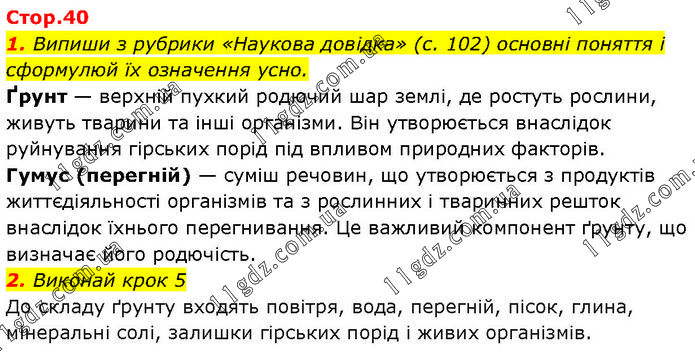 1. Випиши з рубрики «Наукова довідка» (с. 102) основні поняття і сформулюй їх означення усно. Ґрунт — верхній пухкий родючий шар землі, де ростуть рослини, живуть тварини та інші організми. Він утворюється внаслідок руйнування гірських порід під впливом природних факторів. Гумус (перегній) — суміш речовин, що утворюється з продуктів життєдіяльності організмів та з рослинних і тваринних решток внаслідок їхнього перегнивання. Це важливий компонент ґрунту, що визначає його родючість. 2. Виконай крок 5 До складу ґрунту входять повітря, вода, перегній, пісок, глина, мінеральні солі, залишки гірських порід і живих організмів.