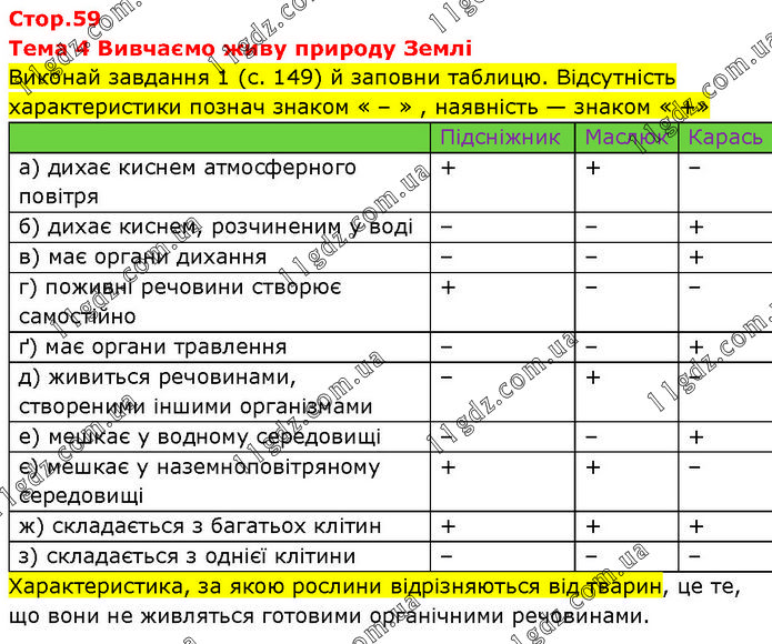 Тема 4 Вивчаємо живу природу Землі Виконай завдання 1 (с. 149) й заповни таблицю. Відсутність характеристики познач знаком « – » , наявність — знаком « +»