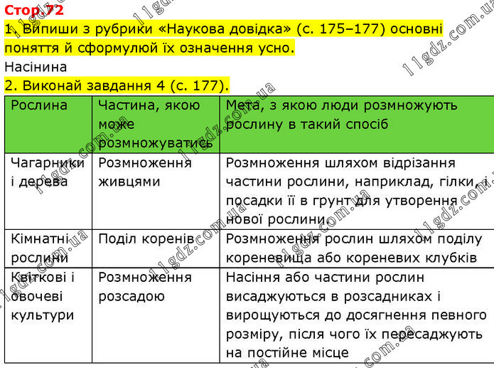 1. Випиши з рубрики «Наукова довідка» (с. 175–177) основні поняття й сформулюй їх означення усно. Насінина 2. Виконай завдання 4 (с. 177).