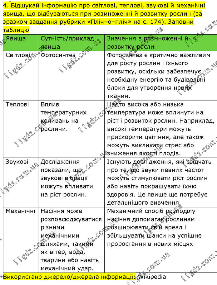 Відшукай інформацію про світлові, теплові, звукові й механічні явища, що відбуваються при розмноженні й розвитку рослин (за зразком завдання рубрики «Пліч–о–пліч» на с. 174). Заповни таблицю