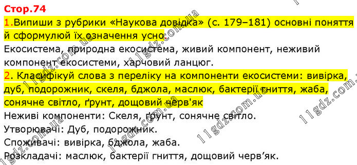 1. Випиши з рубрики «Наукова довідка» (с. 179–181) основні поняття й сформулюй їх означення усно. Екосистема, природна екосистема, живий компонент, неживий компонент екосистеми, харчовий ланцюг. 2. Класифікуй слова з переліку на компоненти екосистеми: вивірка, дуб, подорожник, скеля, бджола, маслюк, бактерії гниття, жаба, сонячне світло, ґрунт, дощовий черв'як Неживі компоненти: Скеля, ґрунт, сонячне світло. Утворювачі: Дуб, подорожник. Споживачі: вивірка, бджола, жаба. Розкладачі: маслюк, бактерії гниття, дощовий черв’як.