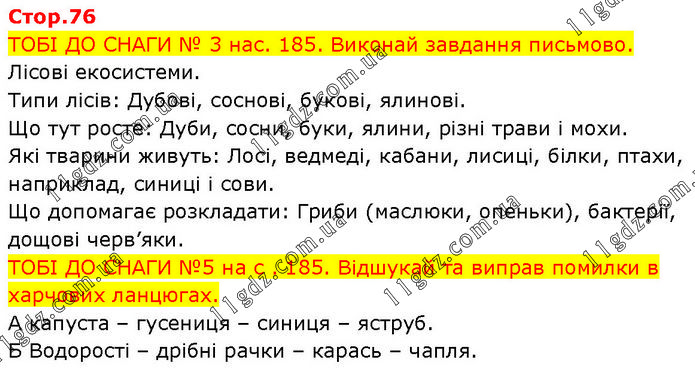 ТОБІ ДО СНАГИ № 3 нас. 185. Виконай завдання письмово. Лісові екосистеми. Типи лісів: Дубові, соснові, букові, ялинові. Що тут росте: Дуби, сосни, буки, ялини, різні трави і мохи. Які тварини живуть: Лосі, ведмеді, кабани, лисиці, білки, птахи, наприклад, синиці і сови. Що допомагає розкладати: Гриби (маслюки, опеньки), бактерії, дощові черв’яки. ТОБІ ДО СНАГИ №5 на с . 185. Відшукай та виправ помилки в харчових ланцюгах. А капуста – гусениця – синиця – яструб. Б Водорості – дрібні рачки – карась – чапля.