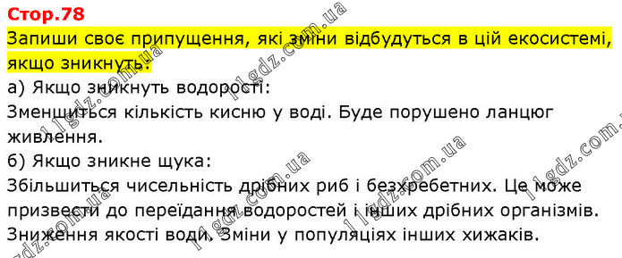Запиши своє припущення, які зміни відбудуться в цій екосистемі, якщо зникнуть: а) Якщо зникнуть водорості: Зменшиться кількість кисню у воді. Буде порушено ланцюг живлення. б) Якщо зникне щука: Збільшиться чисельність дрібних риб і безхребетних. Це може призвести до переїдання водоростей і інших дрібних організмів. Зниження якості води. Зміни у популяціях інших хижаків.