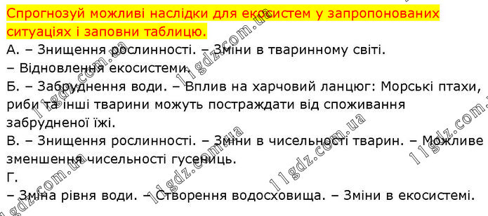 Спрогнозуй можливі наслідки для екосистем у запропонованих ситуаціях і заповни таблицю. А. – Знищення рослинності. – Зміни в тваринному світі. – Відновлення екосистеми. Б. – Забруднення води. – Вплив на харчовий ланцюг: Морські птахи, риби та інші тварини можуть постраждати від споживання забрудненої їжі. В. – Знищення рослинності. – Зміни в чисельності тварин. – Можливе зменшення чисельності гусениць. Г. – Зміна рівня води. – Створення водосховища. – Зміни в екосистемі.