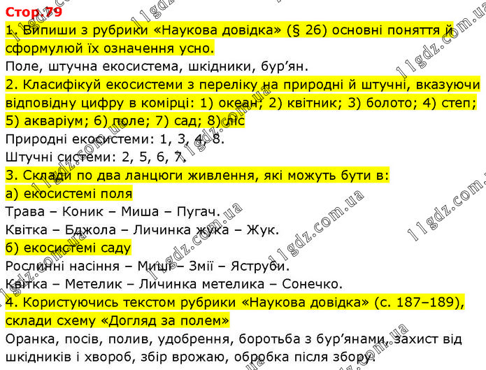 1. Випиши з рубрики «Наукова довідка» (§ 26) основні поняття й сформулюй їх означення усно. Поле, штучна екосистема, шкідники, бур’ян. 2. Класифікуй екосистеми з переліку на природні й штучні, вказуючи відповідну цифру в комірці: 1) океан; 2) квітник; 3) болото; 4) степ; 5) акваріум; 6) поле; 7) сад; 8) ліс Природні екосистеми: 1, 3, 4, 8. Штучні системи: 2, 5, 6, 7. 3. Склади по два ланцюги живлення, які можуть бути в: а) екосистемі поля Трава – Коник – Миша – Пугач. Квітка – Бджола – Личинка жука – Жук. б) екосистемі саду Рослинні насіння – Миші – Змії – Яструби. Квітка – Метелик – Личинка метелика – Сонечко. 4. Користуючись текстом рубрики «Наукова довідка» (с. 187–189), склади схему «Догляд за полем» Оранка, посів, полив, удобрення, боротьба з бур’янами, захист від шкідників і хвороб, збір врожаю, обробка після збору.