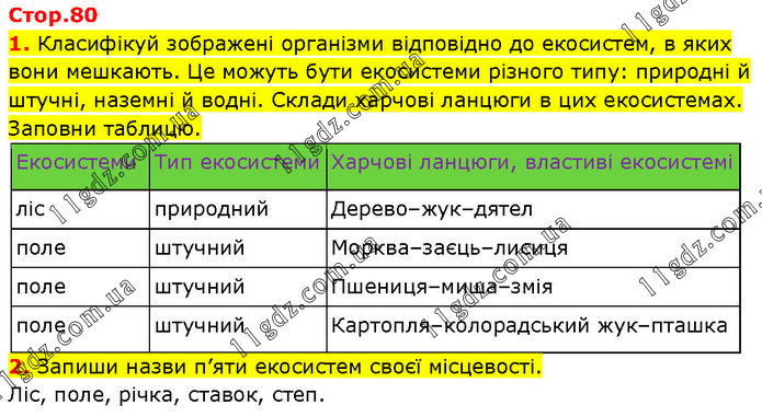 1. Класифікуй зображені організми відповідно до екосистем, в яких вони мешкають. Це можуть бути екосистеми різного типу: природні й штучні, наземні й водні. Склади харчові ланцюги в цих екосистемах. Заповни таблицю. 2. Запиши назви п’яти екосистем своєї місцевості. Ліс, поле, річка, ставок, степ.