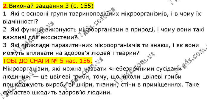 Виконай завдання 3 (с. 155) 1 Які є основні групи твариноподібних мікроорганізмів, і в чому їх відмінності? 2 Які функції виконують мікроорганізми в природі, і чому вони такі важливі для екосистеми? 3 Які приклади паразитичних мікроорганізмів ти знаєш, і як вони можуть впливати на здоров’я людей і тварин? ТОБІ ДО СНАГИ № 5 нас. 156. Мікроорганізми, які можна назвати «небезпечними сусідами людини», — це цвілеві гриби, тому, що інколи цвілеві гриби пошкоджують вироби зі шкіри, тканин, стіни в приміщеннях. Таке сусідство шкодить здоров’ю людини.