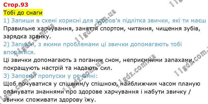 Тобі до снаги 1) Запиши в схемі корисні для здоров’я підлітка звички, які ти маєш Правильне харчування, заняття спортом, читання, чищення зубів, зарядка зранку. 2) Запиши, з якими проблемами ці звички допомагають тобі впоратися. Ці звички допомагають з поганим сном, неприємними запахами, покращують настрій та надають сил. 3) Заповни пропуски у реченні: Щоб почуватися у спішним/у спішною, найближчим часом планую опанувати знаннями про здорове харчування і набути звичку / звички споживати здорову їжу.