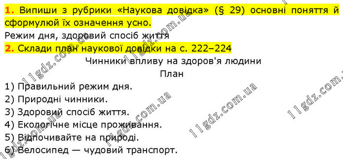 1. Випиши з рубрики «Наукова довідка» (§ 29) основні поняття й сформулюй їх означення усно. Режим дня, здоровий спосіб життя 2. Склади план наукової довідки на с. 222–224 Чинники впливу на здоров'я людини План 1) Правильний режим дня. 2) Природні чинники. 3) Здоровий спосіб життя. 4) Екологічне місце проживання. 5) Відпочивайте на природі. 6) Велосипед — чудовий транспорт.