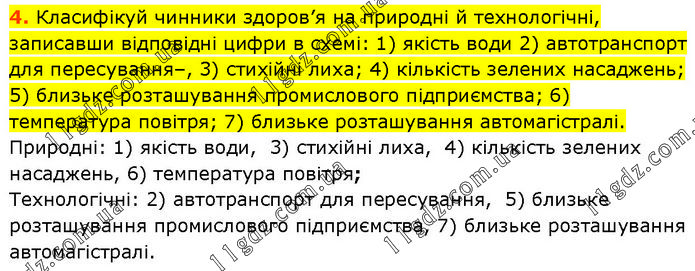 Класифікуй чинники здоров’я на природні й технологічні, записавши відповідні цифри в схемі: 1) якість води 2) автотранспорт для пересування–, 3) стихійні лиха; 4) кількість зелених насаджень; 5) близьке розташування промислового підприємства; 6) температура повітря; 7) близьке розташування автомагістралі. Природні: 1) якість води, 3) стихійні лиха, 4) кількість зелених насаджень, 6) температура повітря; Технологічні: 2) автотранспорт для пересування, 5) близьке розташування промислового підприємства, 7) близьке розташування автомагістралі.