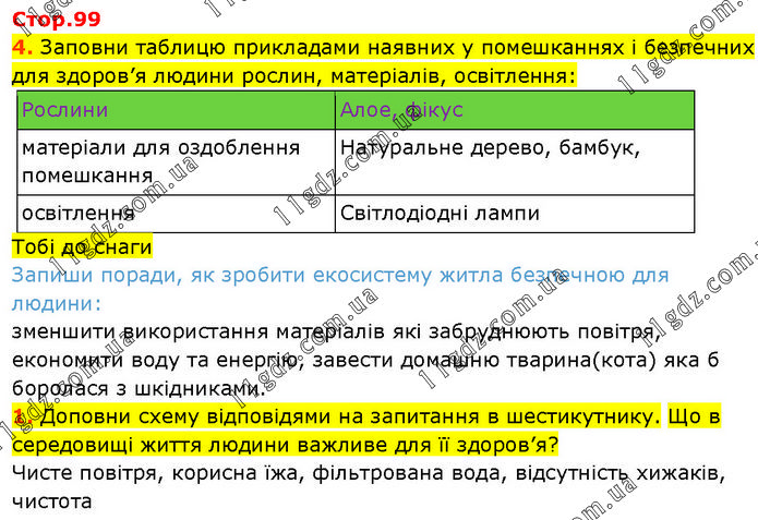 Тобі до снаги Запиши поради, як зробити екосистему житла безпечною для людини: зменшити використання матеріалів які забруднюють повітря, економити воду та енергію, завести домашню тварина(кота) яка б боролася з шкідниками. 1. Доповни схему відповідями на запитання в шестикутнику. Що в середовищі життя людини важливе для її здоров’я? Чисте повітря, корисна їжа, фільтрована вода, відсутність хижаків, чистота