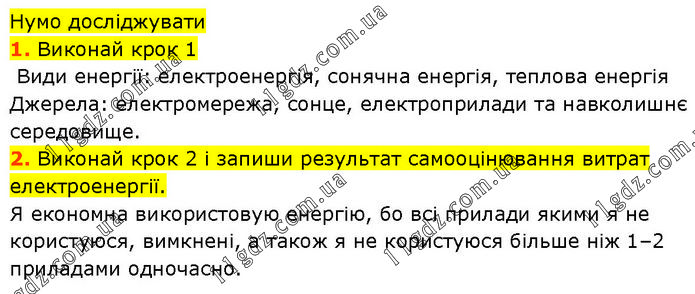 Нумо досліджувати 1. Виконай крок 1 Види енергії: електроенергія, сонячна енергія, теплова енергія Джерела: електромережа, сонце, електроприлади та навколишнє середовище. 2. Виконай крок 2 і запиши результат самооцінювання витрат електроенергії. Я економна використовую енергію, бо всі прилади якими я не користуюся, вимкнені, а також я не користуюся більше ніж 1–2 приладами одночасно.