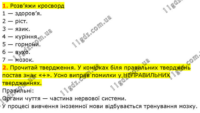 1. Розв’яжи кросворд 1 — здоров’я. 2 — ріст. 3 — язик. 4 — куріння. 5 — гормони. 6 — вухо. 7 — мозок. 2. Прочитай твердження. У комірках біля правильних тверджень постав знак «+». Усно виправ помилки у НЕПРАВИЛЬНИХ твердженнях. Правильні: Органи чуття — частина нервової системи. У процесі вивчення іноземної мови відбувається тренування мозку.