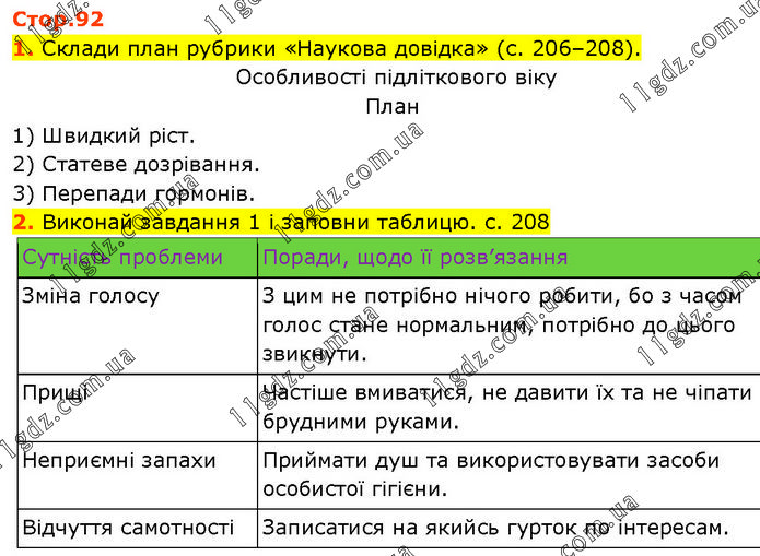 1. Склади план рубрики «Наукова довідка» (с. 206–208). Особливості підліткового віку План 1) Швидкий ріст. 2) Статеве дозрівання. 3) Перепади гормонів. 2. Виконай завдання 1 і заповни таблицю. с. 208
