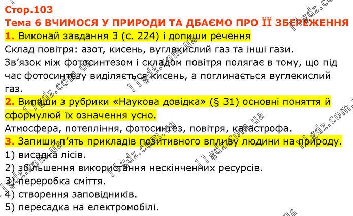 Тема 6 ВЧИМОСЯ У ПРИРОДИ ТА ДБАЄМО ПРО ЇЇ ЗБЕРЕЖЕННЯ 1. Виконай завдання 3 (с. 224) і допиши речення Склад повітря: азот, кисень, вуглекислий газ та інші гази. Зв’язок між фотосинтезом і складом повітря полягає в тому, що під час фотосинтезу виділяється кисень, а поглинається вуглекислий газ. 2. Випиши з рубрики «Наукова довідка» (§ 31) основні поняття й сформулюй їх означення усно. Атмосфера, потепління, фотосинтез, повітря, катастрофа. 3. Запиши п’ять прикладів позитивного впливу людини на природу. 1) висадка лісів. 2) збільшення використання нескінченних ресурсів. 3) переробка сміття. 4) створення заповідників. 5) пересадка на електромобілі.