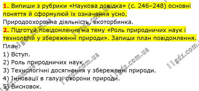 1. Випиши з рубрики «Наукова довідка» (с. 246–248) основні поняття й сформулюй їх означення усно. Природоохоронна діяльність, екоторбинка. 2. Підготуй повідомлення на тему «Роль природничих наук і технологій у збереженні природи». Запиши план повідомлення. План: 1) Вступ. 2) Роль природничих наук. 3) Технологічні досягнення у збереженні природи. 4) Інновації в галузі охорони природи. 5) Висновок.