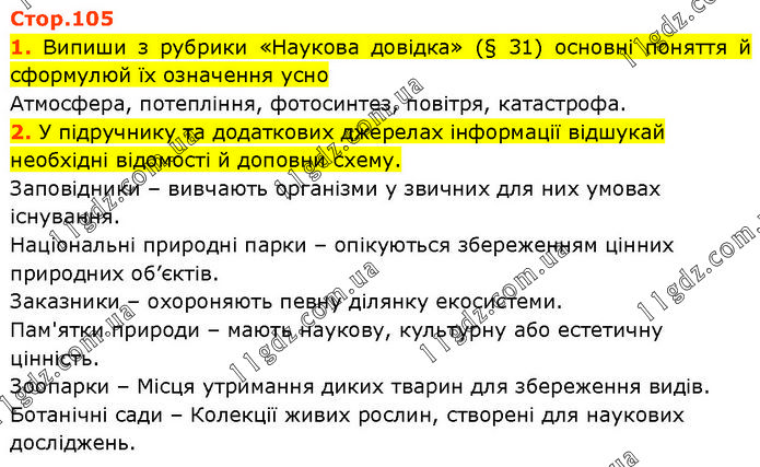 1. Випиши з рубрики «Наукова довідка» (§ 31) основні поняття й сформулюй їх означення усно Атмосфера, потепління, фотосинтез, повітря, катастрофа. 2. У підручнику та додаткових джерелах інформації відшукай необхідні відомості й доповни схему. Заповідники – вивчають організми у звичних для них умовах існування. Національні природні парки – опікуються збереженням цінних природних об’єктів. Заказники – охороняють певну ділянку екосистеми. Пам'ятки природи – мають наукову, культурну або естетичну цінність. Зоопарки – Місця утримання диких тварин для збереження видів. Ботанічні сади – Колекції живих рослин, створені для наукових досліджень.