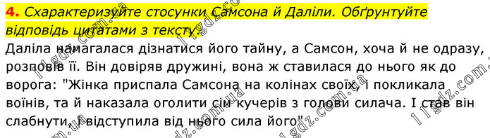 Схарактеризуйте стосунки Самсона й Даліли. Обґрунтуйте відповідь цитатами з тексту. Даліла намагалася дізнатися його тайну, а Самсон, хоча й не одразу, розповів її. Він довіряв дружині, вона ж ставилася до нього як до ворога: "Жінка приспала Самсона на колінах своїх, і покликала воїнів, та й наказала оголити сім кучерів з голови силача. І став він слабнути, і відступила від нього сила його"
